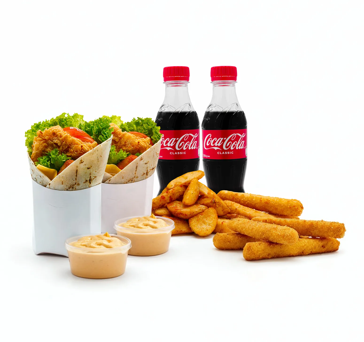 box master 2pieces,small village potatoes 2pieces,cheese sticks 2pieces,cheese sauce 2pieces,Coca-Cola 0.250 ml 2pieces