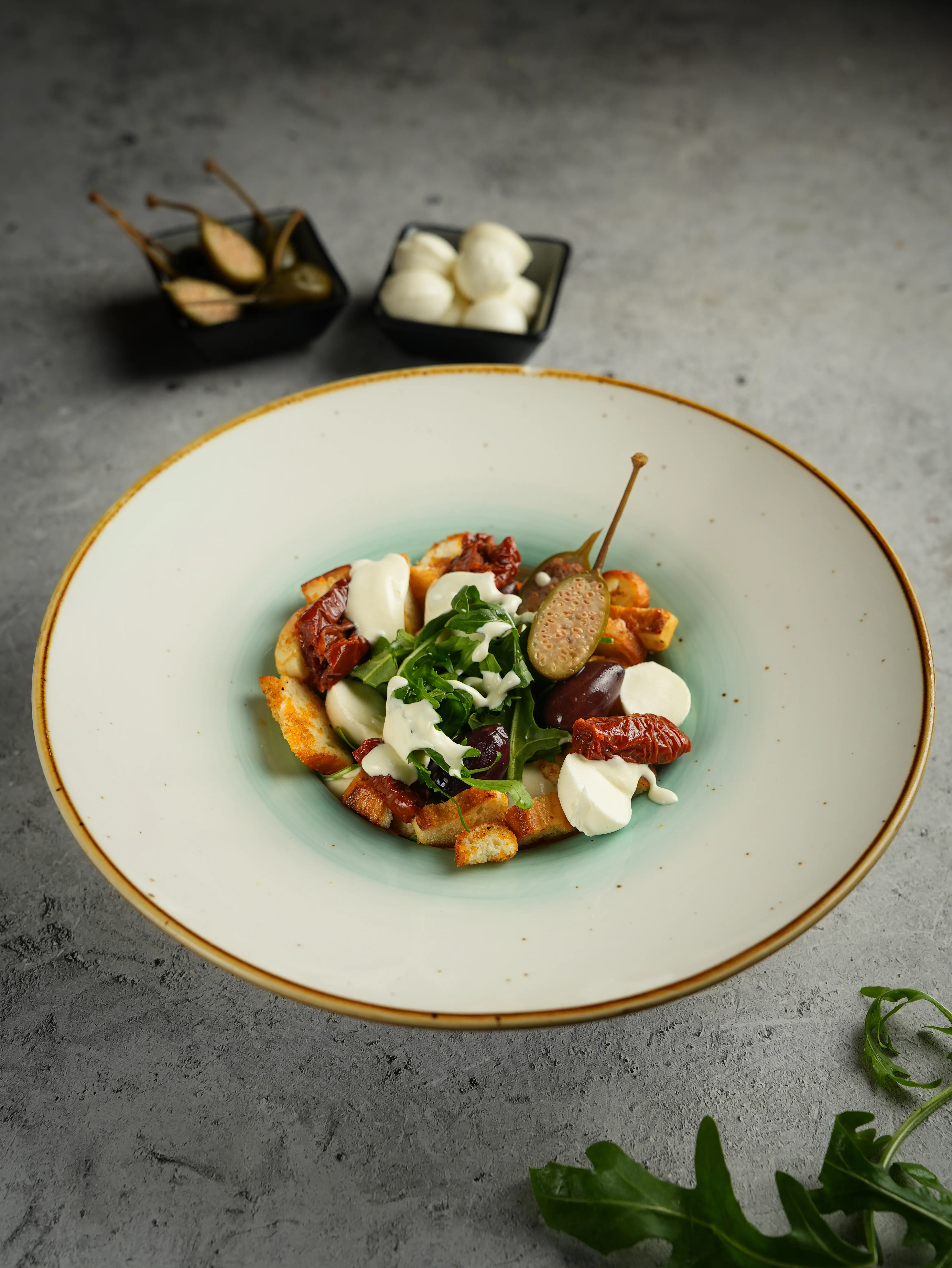 capers, arugula, tomatoes in olive oil, black olives, cherry tomatoes, stracciatella cheese, olive oil, French baguette 220 gr