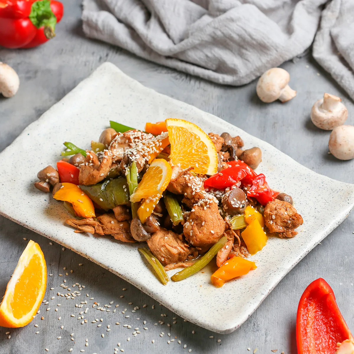 հավի կրծքամիս, շամպինյոն, գունավոր պղպեղ, կոճապղպեղ, նարինջ, նեխուր