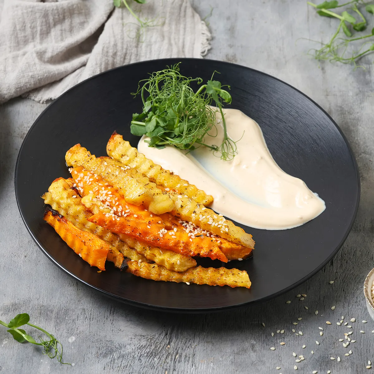 դդում, կարտոֆիլ, համեմունքներ, քունջութ, մայոնեզով սոուս