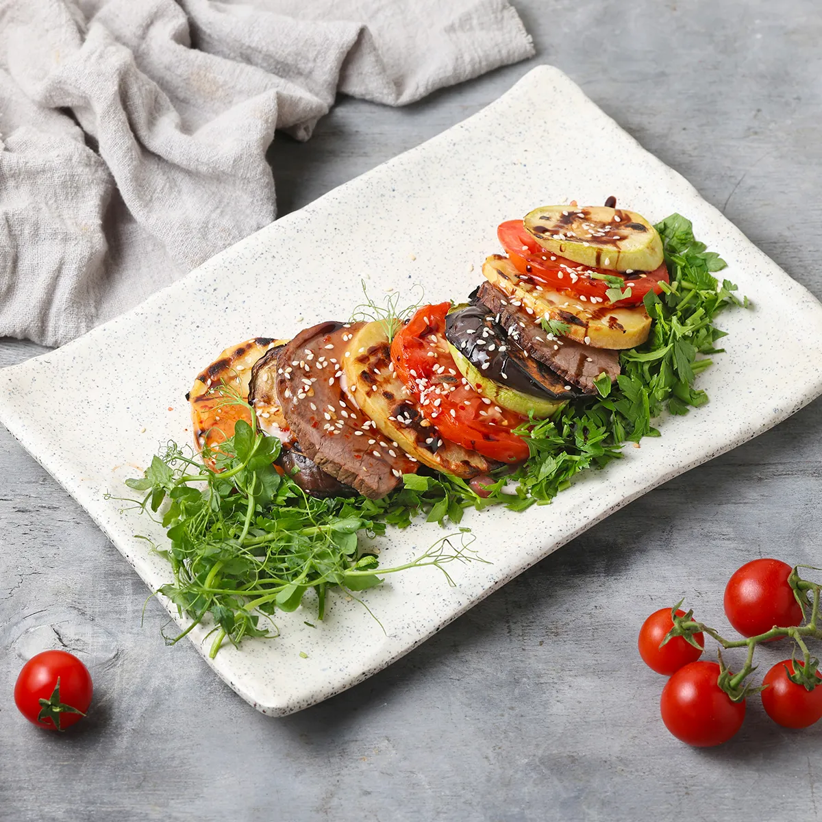 տավարի բուժենինա, կարտոֆիլ, սմբուկ, դդմիկ, լոլիկ, սխտոր, սոուս չիլի (քաղցր)