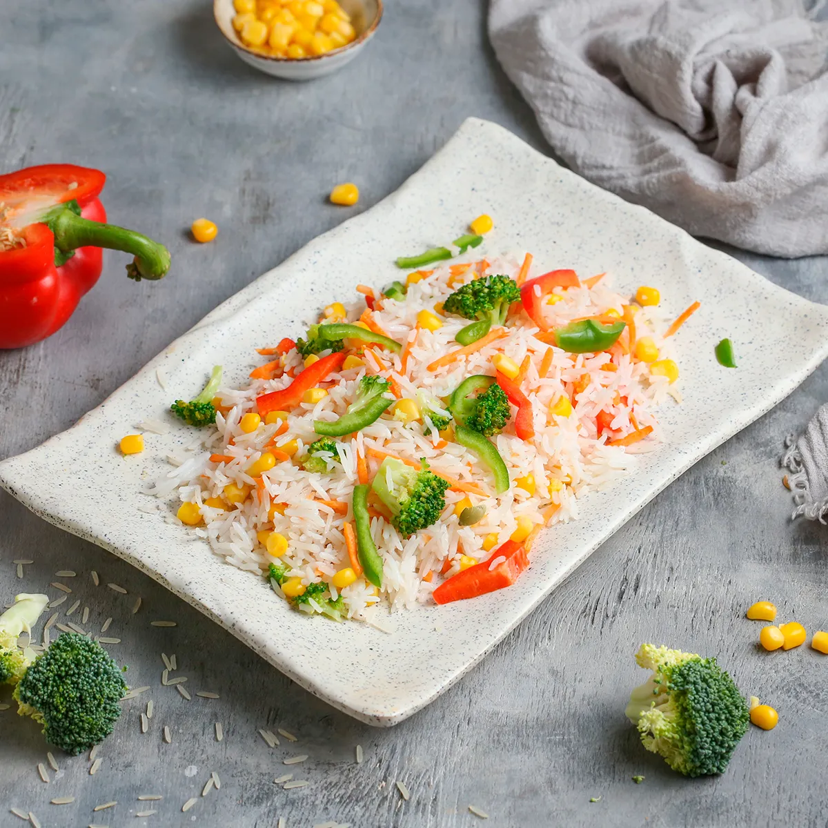 բրինձ բասմատի, բրոկոլի, եգիպտացորեն, գազար, գունավոր պղպեղ